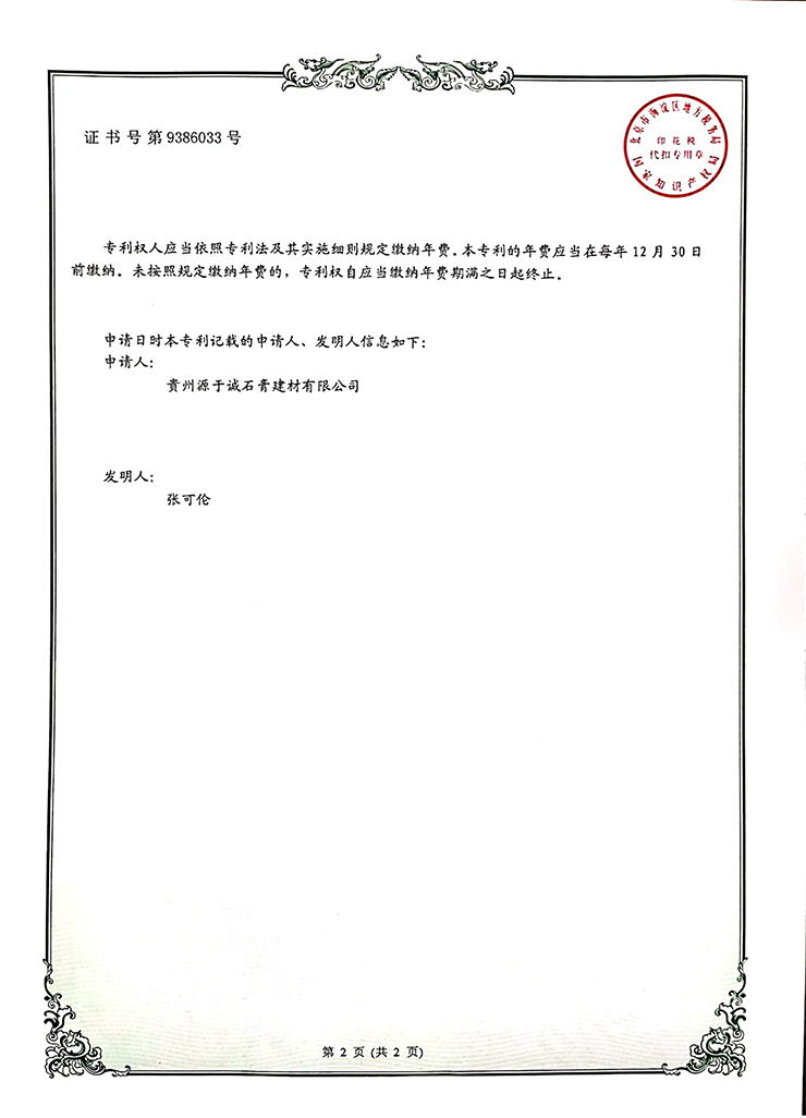 專利證書(shū)(一種石膏板側(cè)壁紙面粘結(jié)裝置)